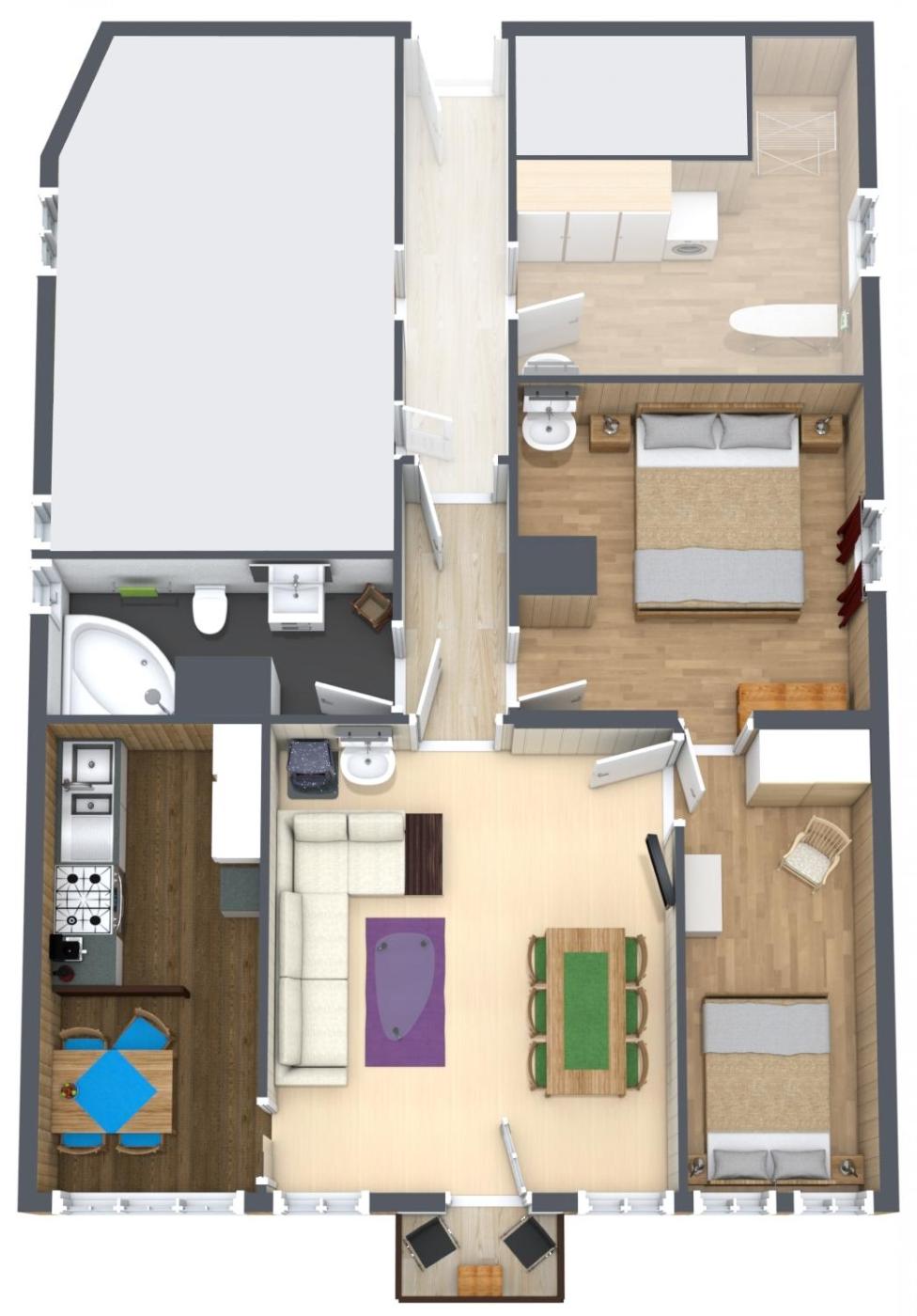 Three-Bedroom Apartment with Mountain View. This spacious apartment comes with 1 living room, 3 separate bedrooms and 2 bathrooms with a bath and free toiletries. Guests can make meals in the kitchen that features a stovetop, a refrigerator, kitchenware and an oven. Boasting a balcony with mountain views, this apartment also features a private entrance and a flat-screen TV with streaming services. The unit has 6 beds.